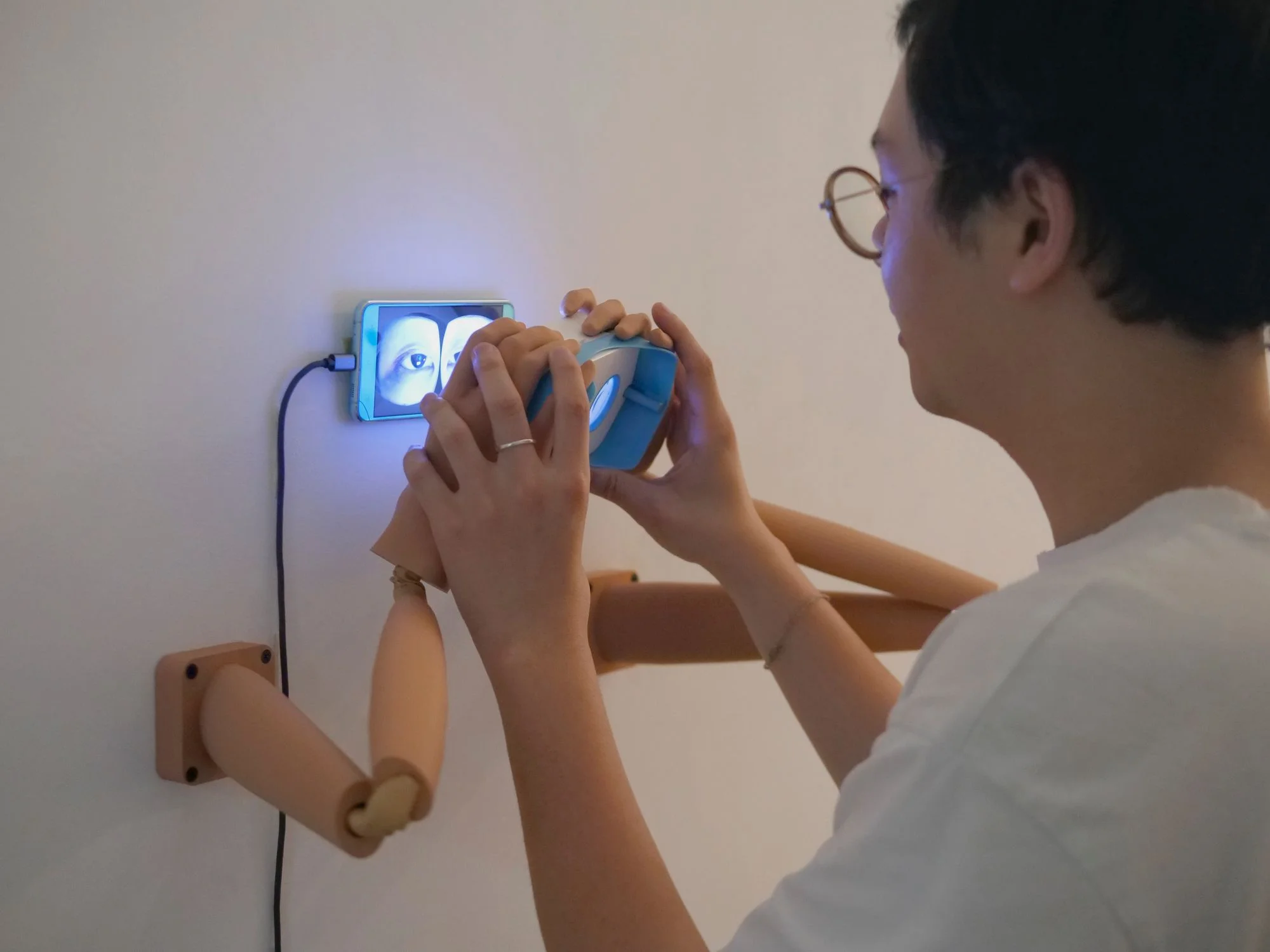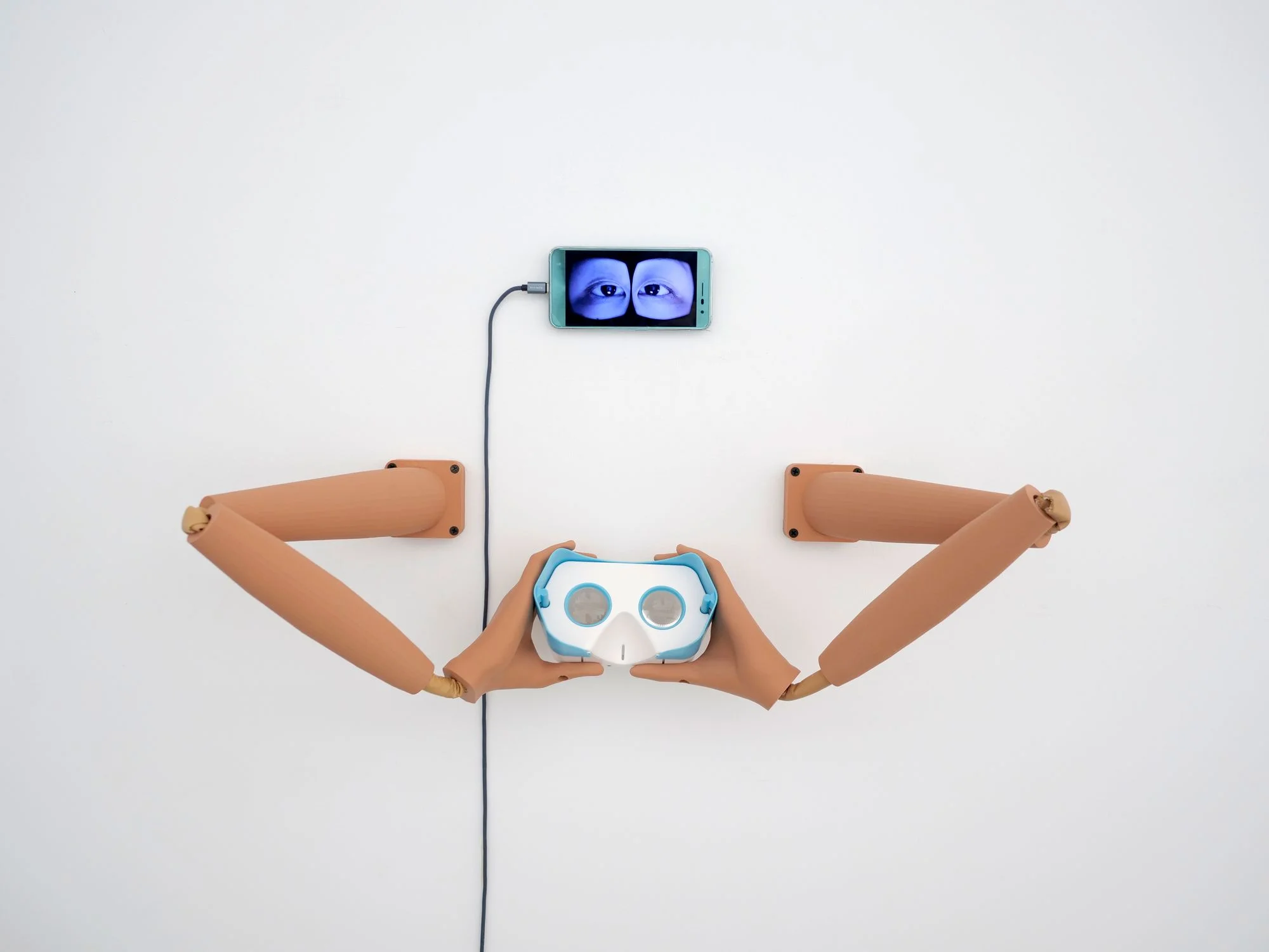 手機中播放著一雙眼睛的影像,並邀請觀者進一步以簡易VR眼鏡觀賞。然而當使用VR眼鏡再度觀看手機時,看到的「一隻眼睛」,並不是現實中任一眼的360度影像,而是一隻由錯視造成、左右兩眼交疊而成的全新眼睛;而當看著這隻眼睛,其中倒映出的視野,也提供了觀者虛擬的鏡像。