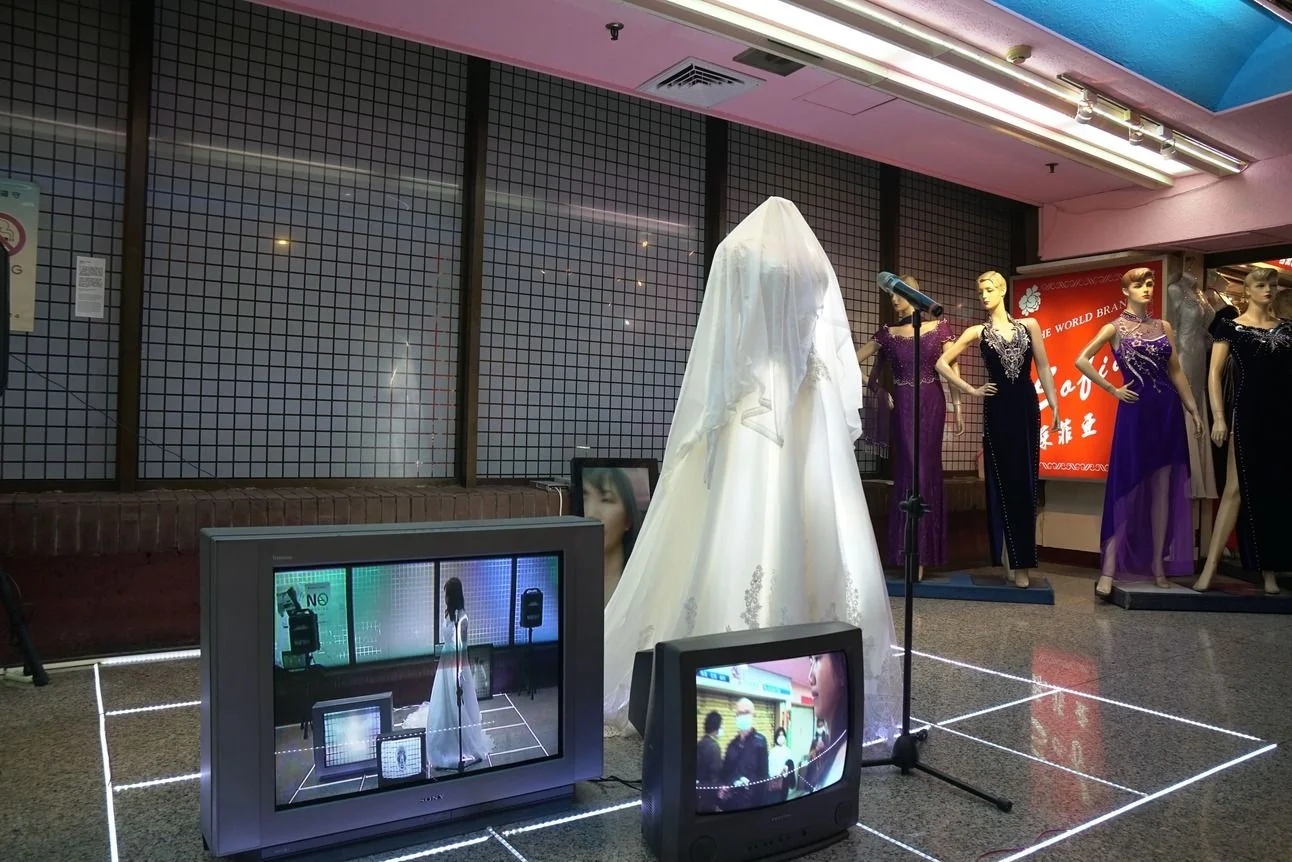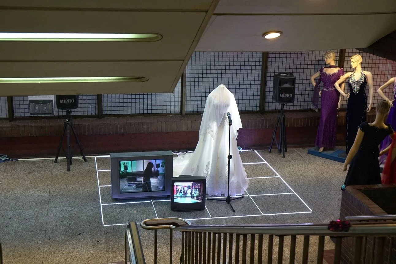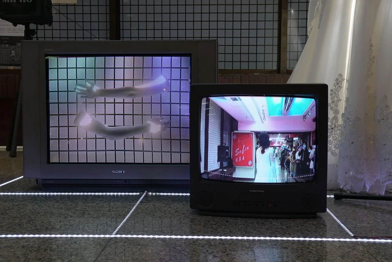 隨處可見的6000K白色LED燈作為我身體的一部分及延伸,我在大樓裡穿著縫製了燈條的禮服,留下四處遊蕩的痕跡並拍攝下來;將我的身體局部掃描成3D模型,在電視螢幕中不停旋轉著;在禮服店旁框出一個發光的舞台,表演一支混合現場聲音與電子音樂的舞曲;最後留下禮服,與電視、舞台和商場的燈光一同發亮。我、身著禮服的人台們,以及電視中的3D影像是這麼地相像、接近卻又疏離,如同白色燈光的殘影般在獅子林大樓裡縈繞不去。
