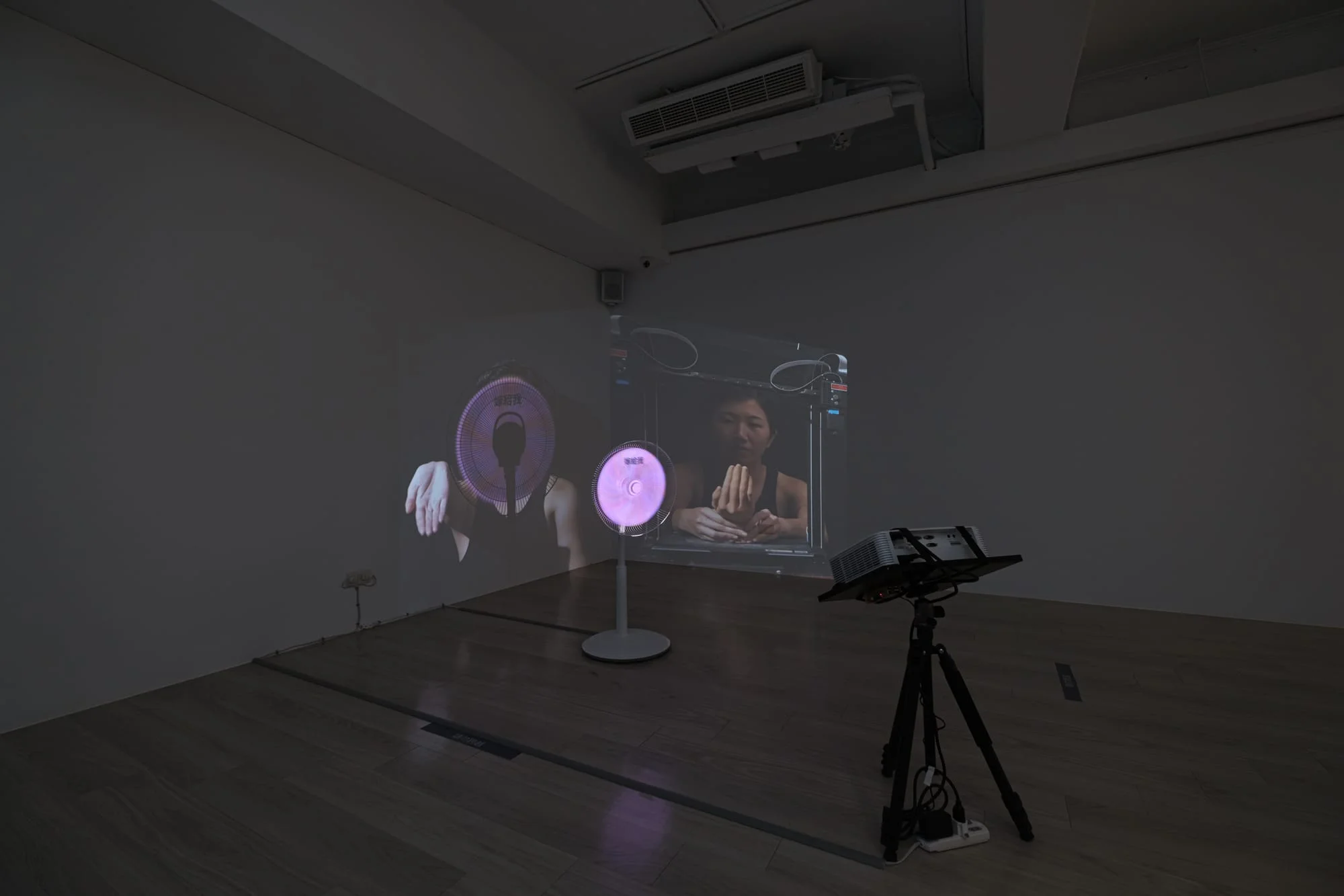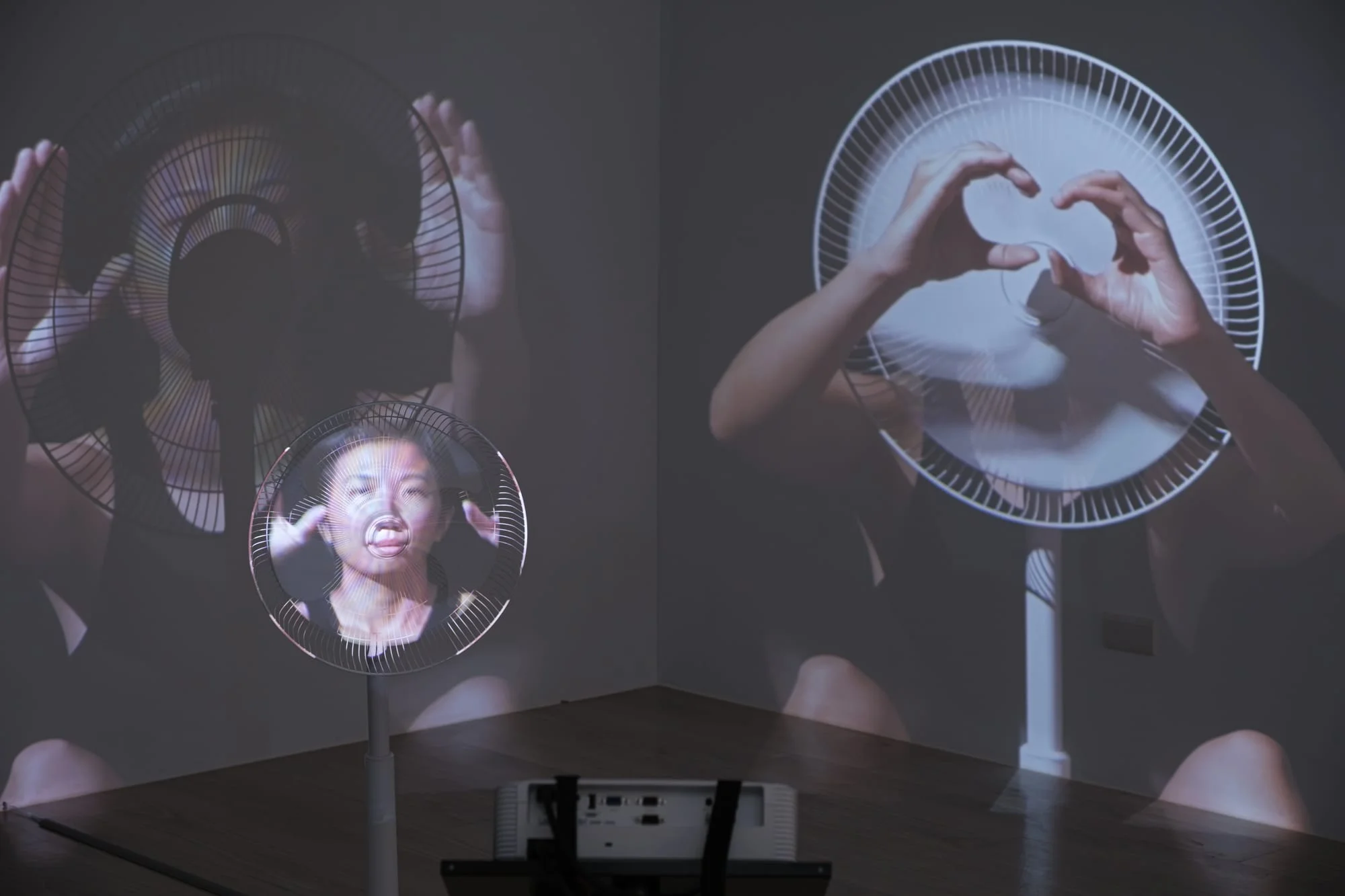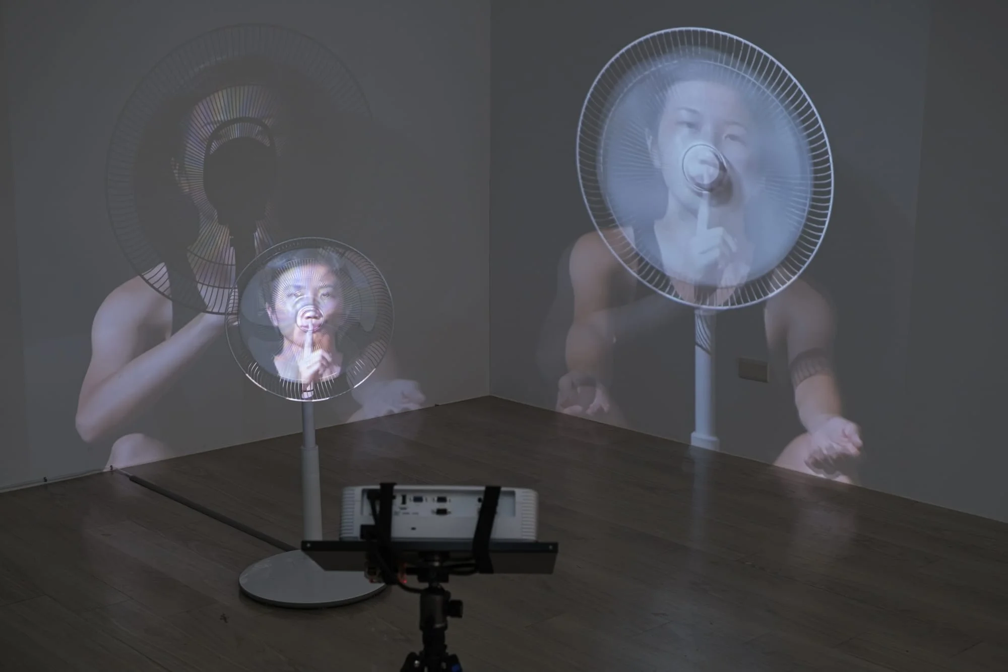 在一片風聲的靜默中,思緒同時是說話也是聆聽。我採集了一些意識狀態下的時間感知剖面,試著讓它在循環的扇葉、不同狀態下視野的穿透性及流動的空氣中顯現。