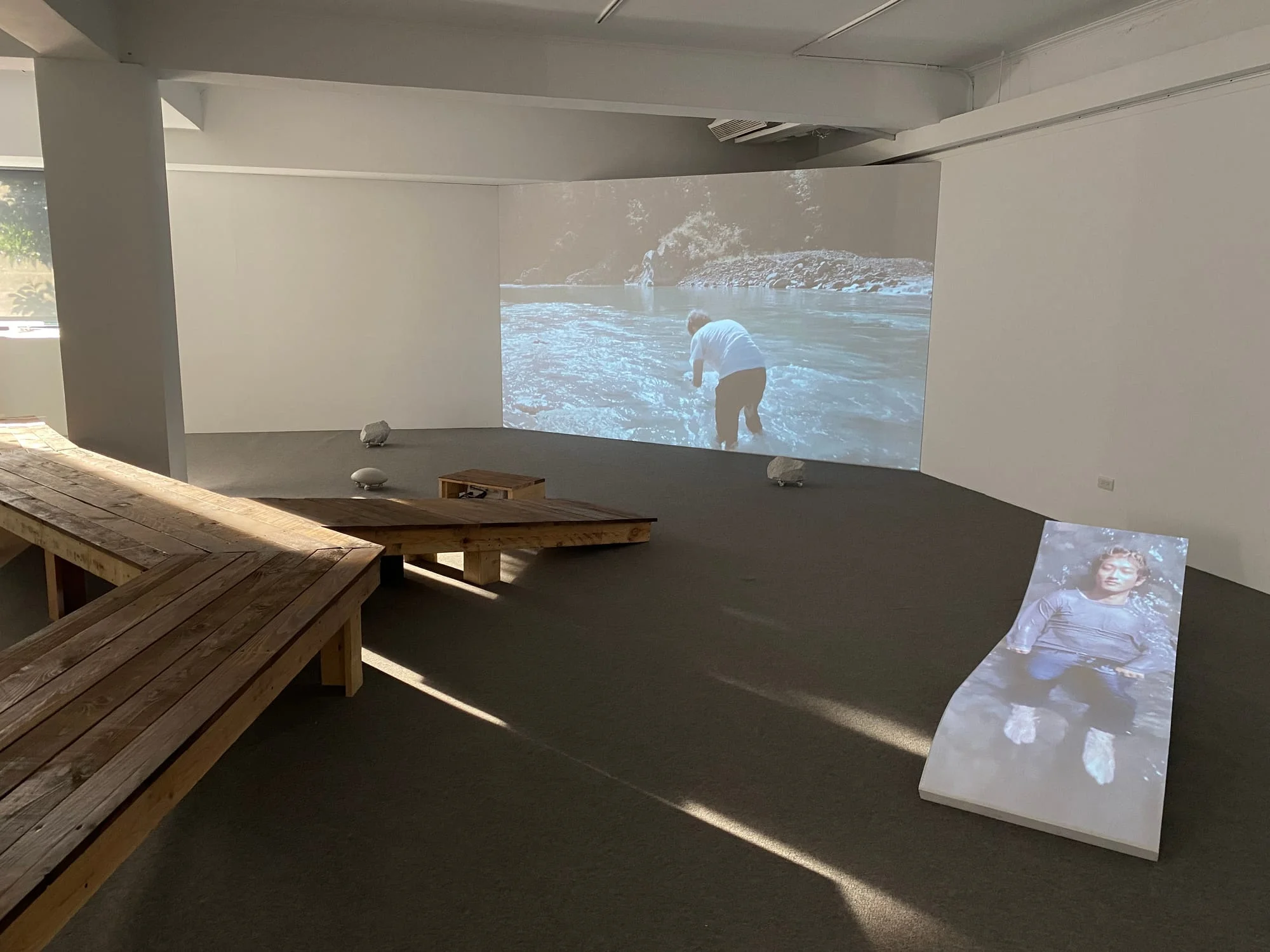 《走在水上》中的影像都以單一的主要人物、以及其在所處環境中的行為為主體。〈打水漂的人〉、〈漂浮的人〉與〈橋下的人〉三部影像共構了一組水域,並鋪設了可供行走或坐臥的舒適木棧道,木棧道以外則鋪設了地毯。觀眾被邀請走入一個想像中的水域,即便走下木棧道腳也不會弄濕,質地上具有親密感、顏色卻中性的地毯,與安裝了輪子、可供觀眾自由移動位置的溪石,讓走下木棧道、漫步在地毯上的經驗,成為一種影像中情景的「再體驗」。我們用一種舊地重遊的情懷再次來訪,而正因為是「重遊」而非親身經歷,「情懷」的況味才得以漫射在其中。對比之下,木棧道左側轉角內〈橋下的人〉影像前則沒有鋪設地毯,展場的地板成了第二層心理上的水域,如果說地毯營造的心理水面浸至小腿肚、能讓我們穿梭其中踩踏嬉戲的親密水域,那道地毯與地板之間的界線暗示的,或許則是更深不見底、能將我們吞沒的水體,散發介於危險與召喚的能量,那橋下的人則以一種近乎永恆的姿態、躺臥在這邊界之上。
