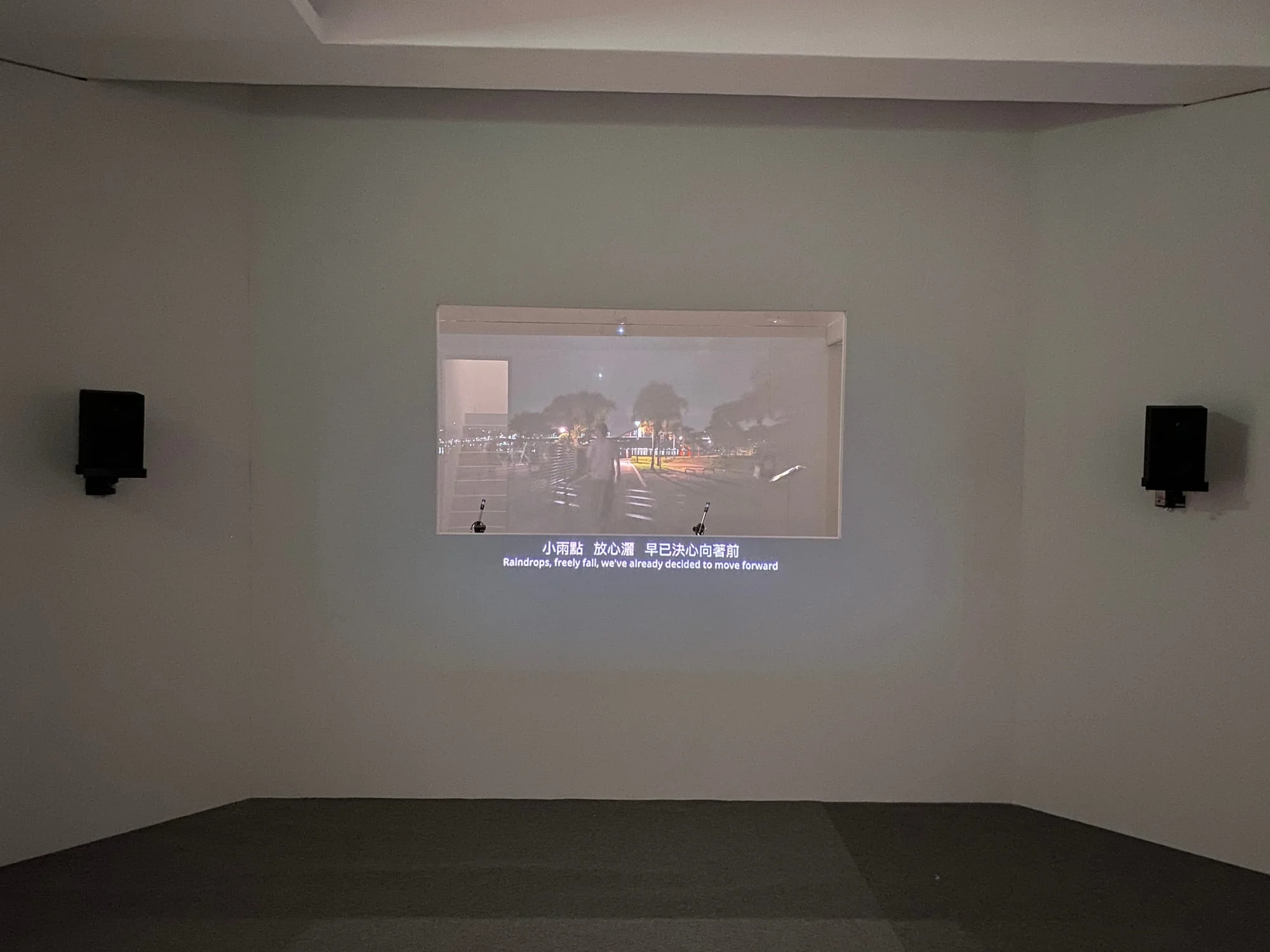 雖然影像是逐個轉瞬即逝的影格,但對我來說,劉昱廷透過影像,如同反覆揉捏紙團的動作,是想要抓住、追回這些轉瞬即逝,使那些時間透過影像中或者觀眾的身體,體現為得以哼唱、流轉的情懷。如果情感是當下的,那情懷就是不合時宜的吧?我不禁思索,當代生活是否越來越缺少一些情懷?這意味著某種目的地或嚮往的缺失嗎?然而藝術家也不是要給出一個目的地,而是把觀眾變成即便從未到訪卻彷彿舊地重遊的訪客,不合時宜地佇立於影像時間的循環之外,在與影像「再同步」的過程中,竟也產生了沒有目的卻仍想要行走的想望。