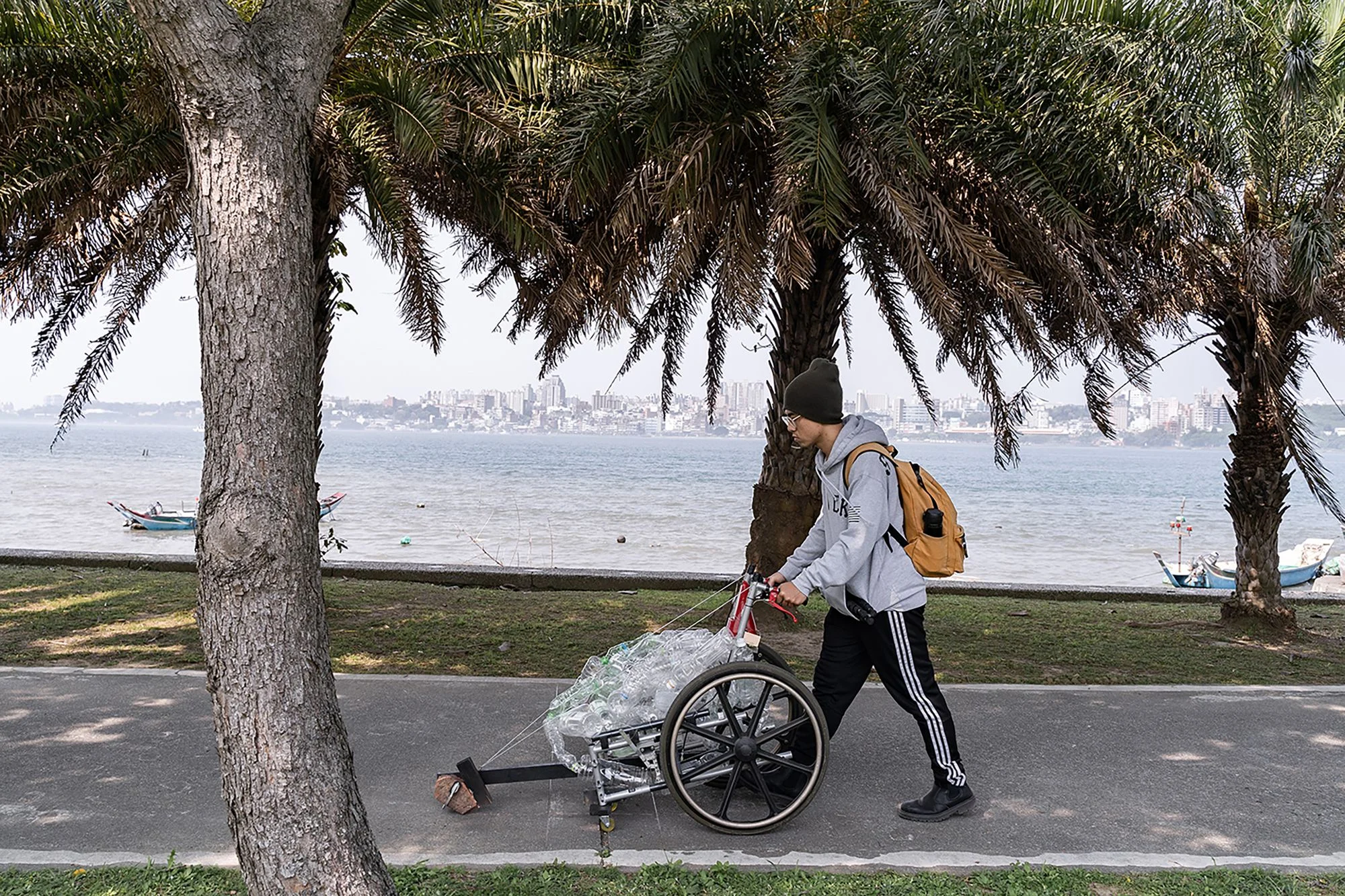 觀看文豪的作品時,在一開始,我的確先被一種對於物件,不知該說是念舊或傷感的氛圍攫獲。動力裝置與影像,不斷以短循環重覆著動態;行為記錄中藝術家的身體,彷彿不是有著線性目標的有機體,而更像一組「故障」的馬達裝置。像是〈城市採集交換計畫:造城〉的前篇,藝術家以關渡竹圍地區的撿拾物加工自製成扭蛋,背著一台扭蛋機在同區域遊走,漫無目的地找尋願意與他以任何東西交換扭蛋的人;〈如何換算一座邊城〉中,藝術家的身體則更直接成為撿拾物推車的動力來源,以無效率的方式收集路上更多的回收物,最後以不敷時間與勞動成本的價錢過磅回收。