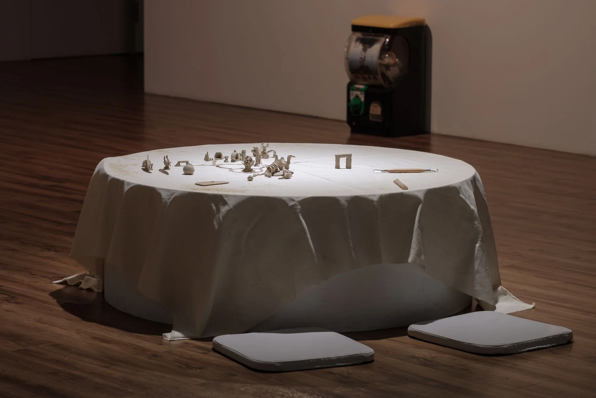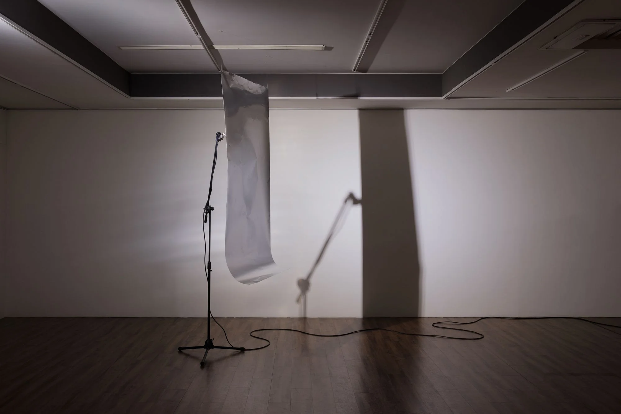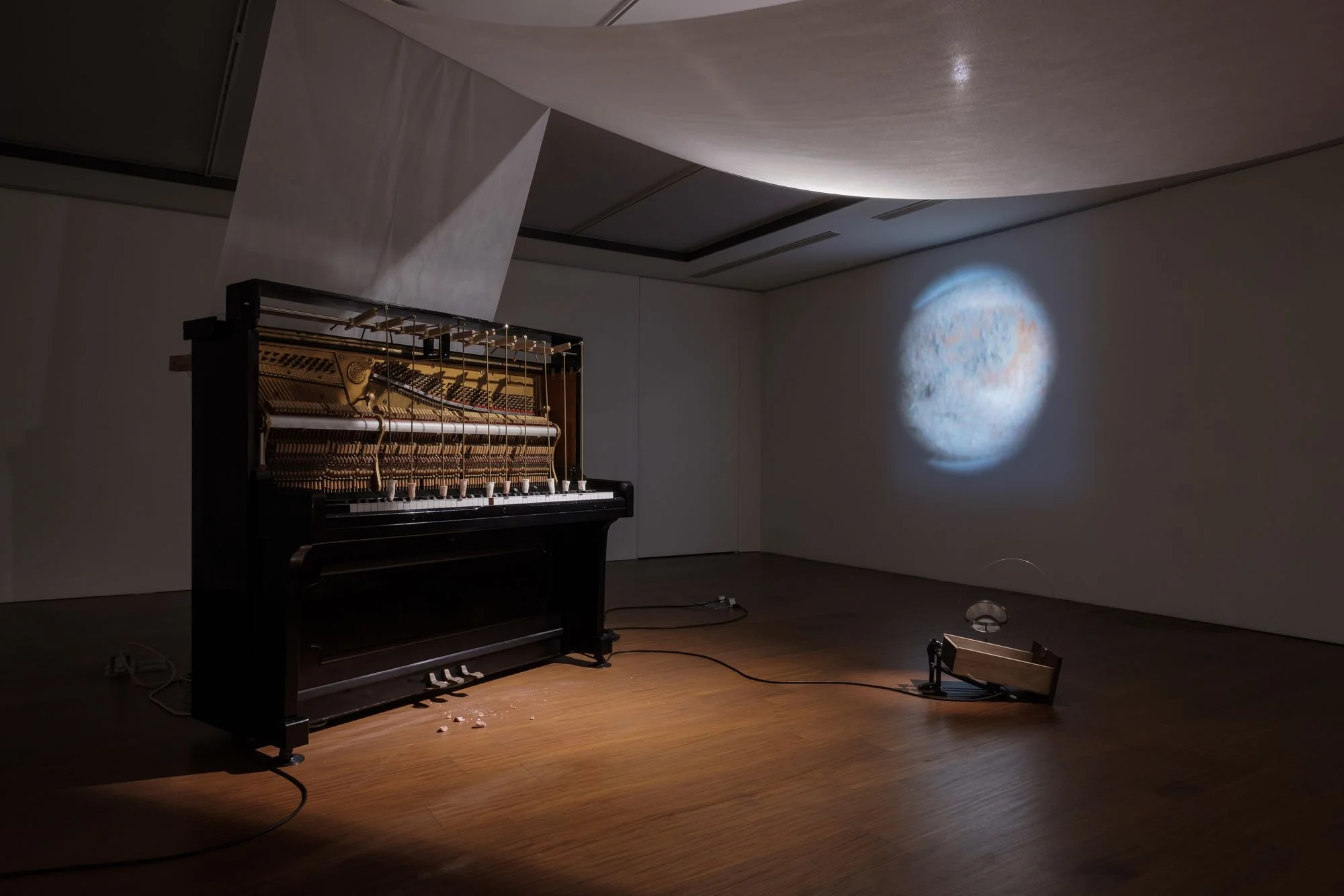 文豪曾於在地實驗舉辦的系列分享中,提及自己如何看待街頭不斷反覆出現的施工工地。像這樣建造中的、不斷朝向未來的「進行式」本身,對他而言,反而像是在不斷地輪迴、重複(註iv),並也曾談及自身家庭經歷產業沒落的變革史。一個循環系統中,最終會回到原點重新開始的特性,也是藝術家透過創作,對時間究竟是「靜」(以結果而言,是靜態不變)、還是「動」(以過程而言,是不斷在動)提問的切入方式。〈十二分之一的黏著〉似乎就自成一個循環系統、擁有其獨立的時間。投影在牆上似星球的影像,與實際在地上抽屜中自轉的雜質小球,像是在同個星系中運轉;而鋼琴上方向前延伸的吊掛紙捲,被設計成每一小時會捲動12秒,逐漸地將遠方的紙捲拉回鋼琴上方,隨著展期慢慢地回捲直到結束,類似於時間倒流的關係(註v)。這些物件雖然不斷地在「動」,與進行式有著相似的「永不停止」的無盡頭感受,所呈現的時間狀態卻介於行進與靜止、活動與死亡之間,不像永遠以「生」為願景的進行式,無限地倡議著「活」與「動」。