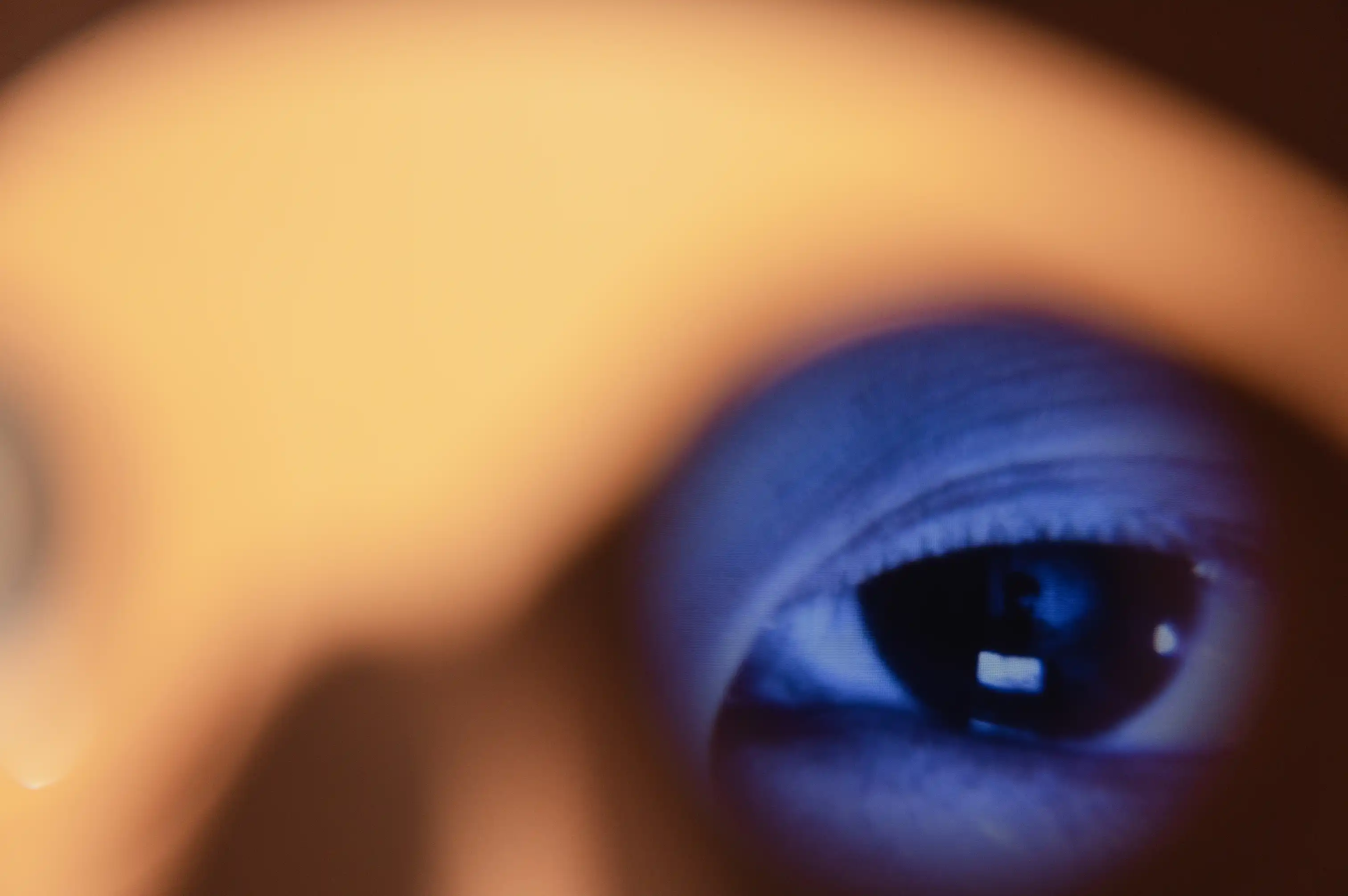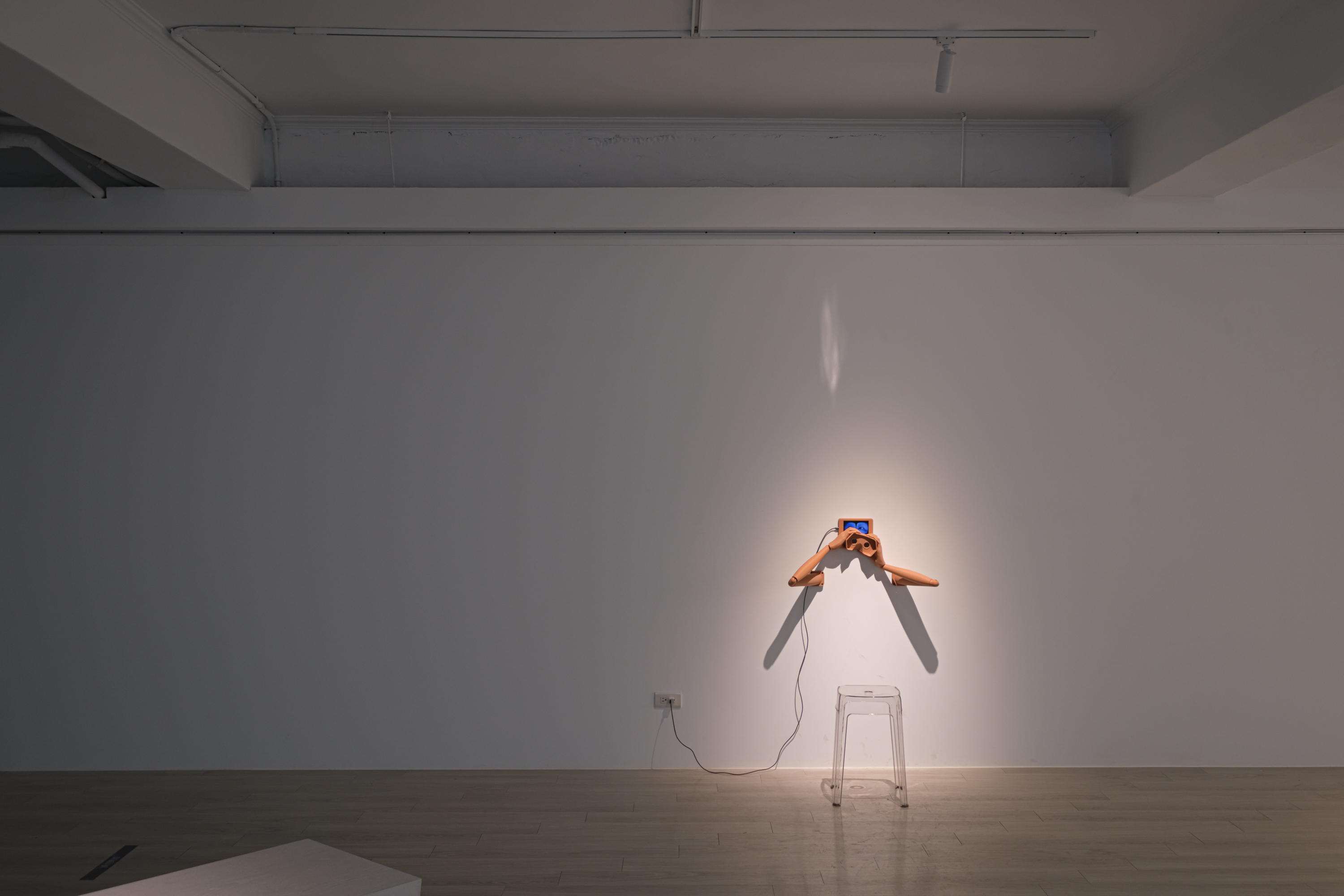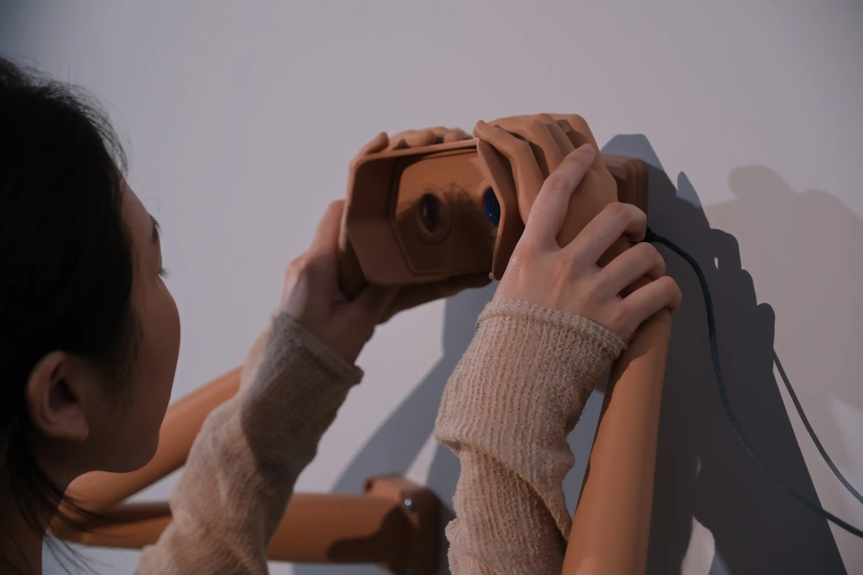 The screen displays an image of a pair of eyes, and the viewer can sit down, grasp these robotic arms, and engage in mutual gazing with them. Unlike before, through the VR glasses held by the arms, the viewer will see a synthetic eye formed by the overlapping of both eyes, rather than a representation of either eye as it appears in reality.