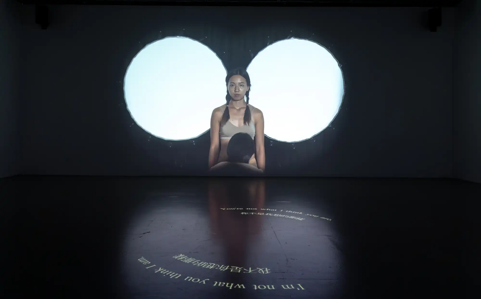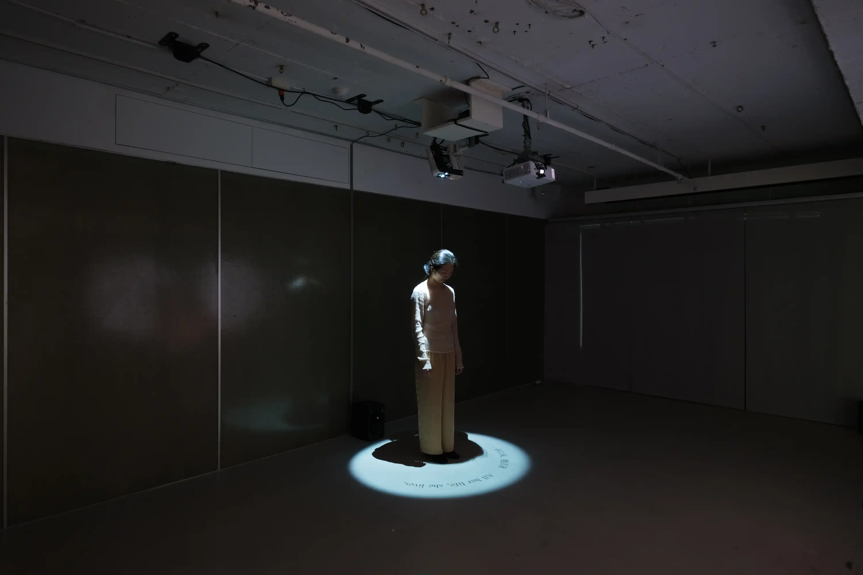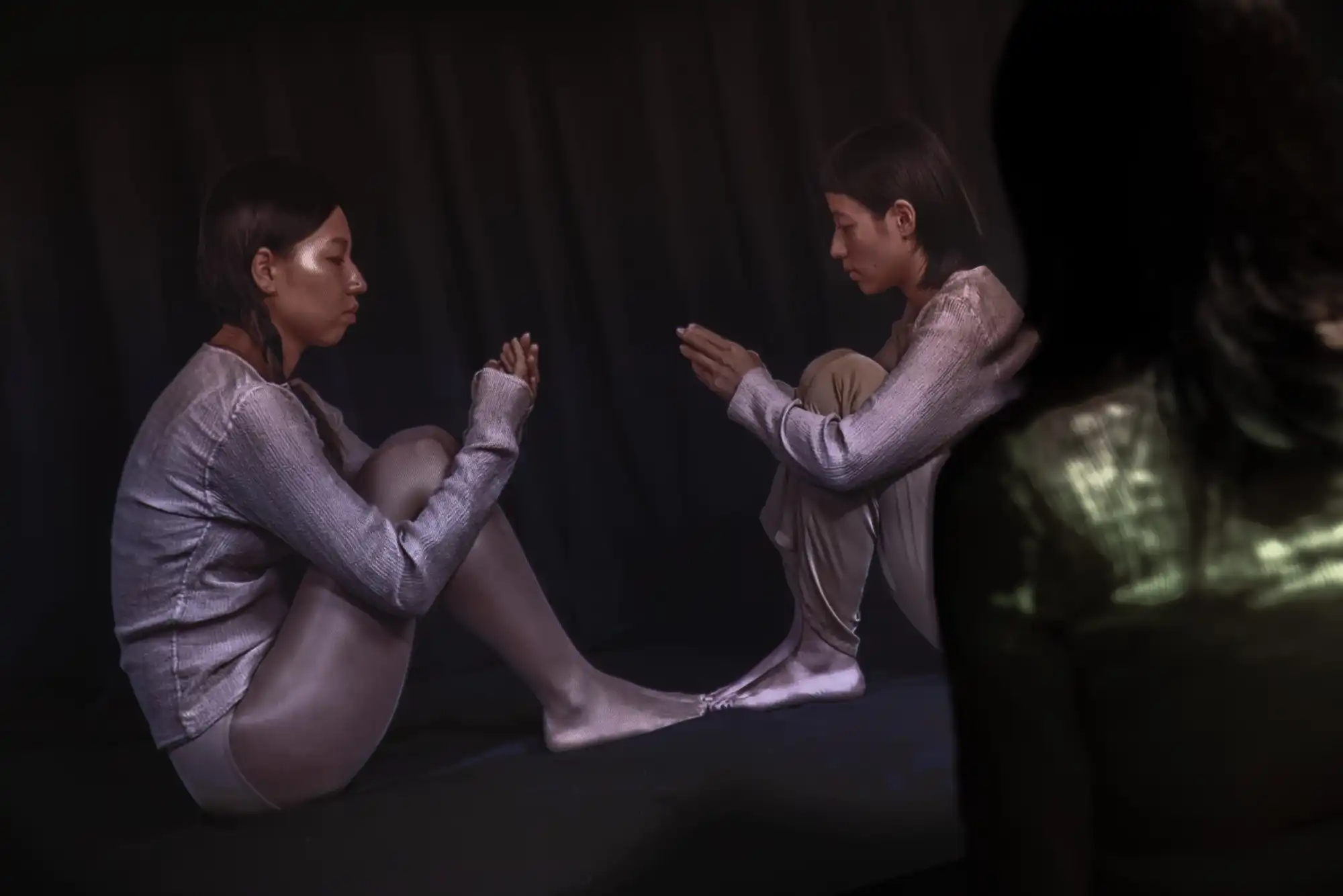 This work starts with one performer whispering a monologue. When the second performer joins, they reenact the first performer’s act together, creating an impression of mirroring each other’s solo performance. The work delves into different facets of self-awareness, such as what others might represent in our imagination, what we might appear in others’ imagination, and the image of “myself” that we envision.